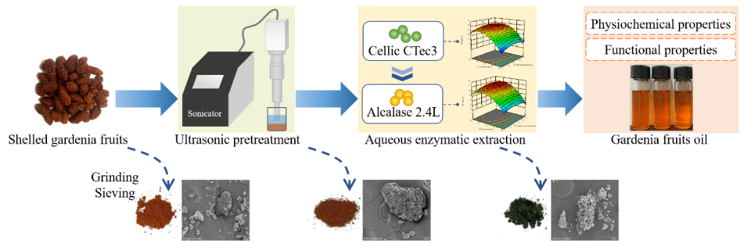 团队基于超声波技术建立了超声预处理结合分步水酶法提取栀子油的新方法,克服了栀子油提取技术受限、提取率低的问题。该成果以Ultrasound-assisted aqueous enzymatic extraction of gardenia fruits (Gardenia jasminoides Ellis) oil: Optimization and quality evalsuation为题,在Industrial Crops & Products上发表,王丹丽博士为第一作者。