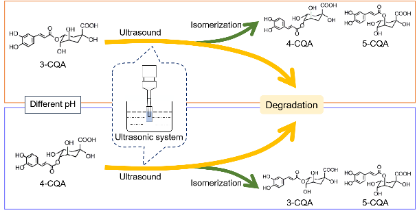 基于国家自然科学基金“超声效应对杭白菊中咖啡酰奎宁酸稳定性影响及其机理研究”的支持,团队研究了咖啡酰奎宁酸类物质的超声加工稳定性,解决了这类物质在超声体系中降解、转化规律不明的问题。该成果以Ultrasonic degradation kinetics and isomerization of 3- and 4-O-caffeoylquinic acid at various pH: The protective effects of ascorbic acid and epigallocatechin gallate on their stability和Degradation kinetics and isomerization of 5-O-caffeoylquinic acid under ultrasound: Influence of epigallocatechin gallate and vitamin C为题,分别在Ultrasonics Sonochemistry和Food Chemistry: X上发表。王丹丽博士为第一作者。