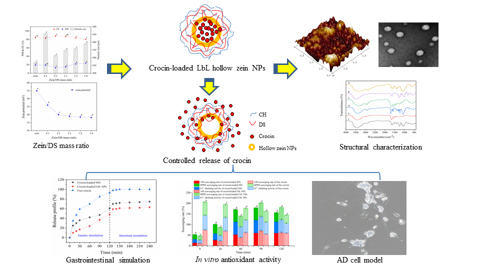 团队研究了层层自组装(LbL)技术制备负载藏红花素的中空硫酸葡聚糖/壳聚糖(DS/CH)包覆玉米醇溶蛋白纳米颗粒,并探究其对治疗阿尔茨海默病(AD)的潜在功效,解决了红花素高度不稳定性和对加工条件敏感等问题。该成果以Layer-by-layer self-assembly of hollow dextran sulfate/chitosan-coated zein nanoparticles loaded with crocin: Fabrication, structural characterization and potential biological fate为题,在Food Hydrocolloids上发表文章一篇,宋恭帅博士为第一作者;以“一种负载藏红花素玉米醇溶蛋白纳米颗粒的制备方法及应用”为题,获得发明专利授权一件,龚金炎教授为第一发明人。