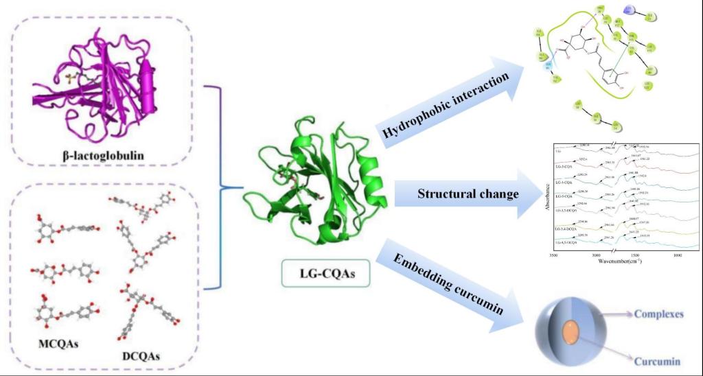 团队研究了蛋白-多酚复合物的形成机制和潜在应用,利用超声波技术构建了β-乳球蛋白和咖啡酰奎宁酸类物质的共价/非共价复合物,克服了姜黄素等水溶性差的活性物质的递送问题。该系列成果以Comparison of non-covalent binding interactions of six caffeoylquinic acids with β-lactoglobulin: spectroscopic analysis, molecular docking and embedding of curcumin、Sonochemical effects on fabrication, characterization and antioxidant activities of β-lactoglobulin-chlorogenic acid conjugates和Ultrasound-assisted assembly of β-lactoglobulin and chlorogenic acid for non covalent nanocomplex: fabrication, characterization and potential biological function为题,分别在Food Hydrocolloids,Ultrasonics Sonochemistry上发表。研究生刘家源为第一作者。